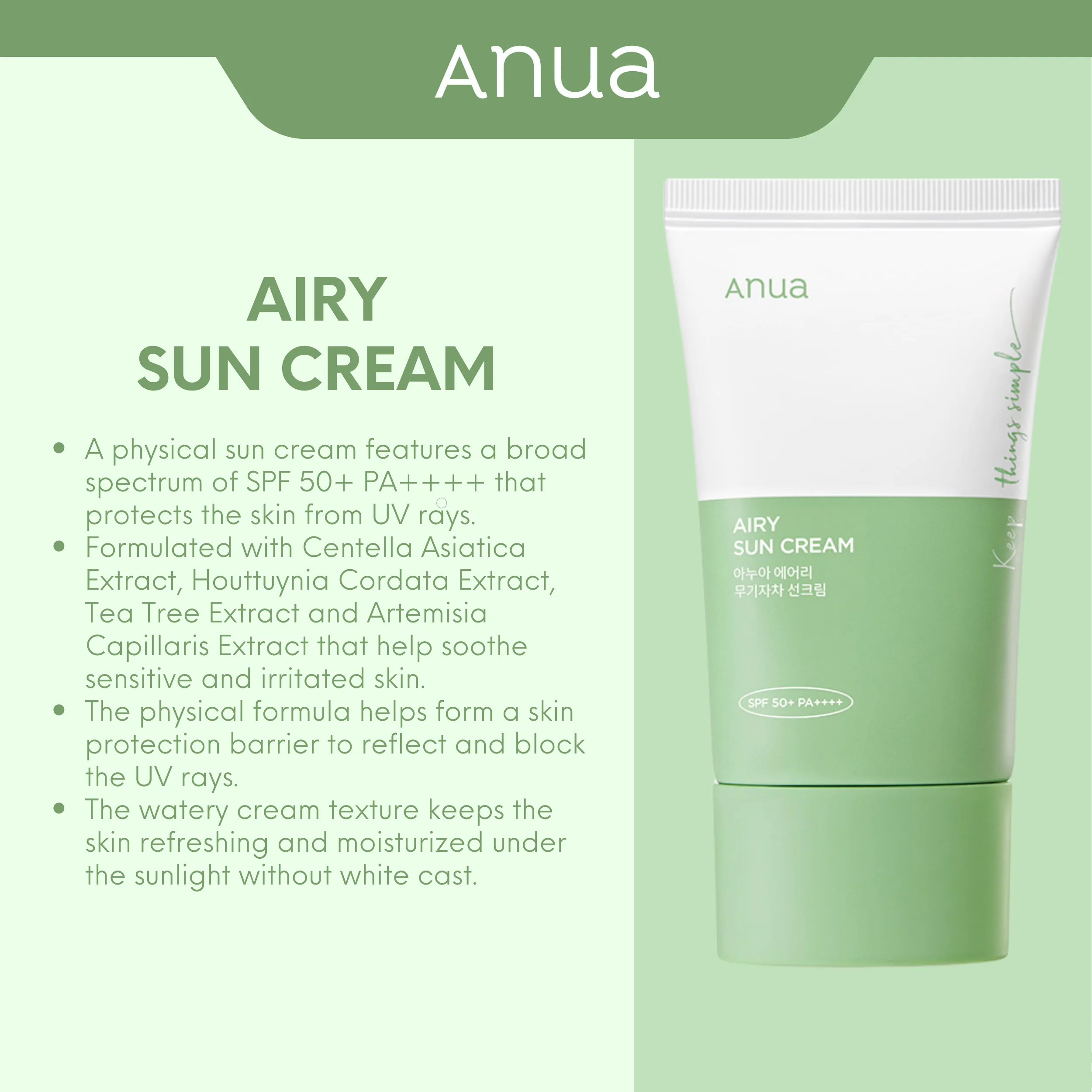 [Anua] Airy Sun Cream SPF 50+ PA++++ 50ML is a lightweight, non-greasy sunscreen that offers high sun protection.