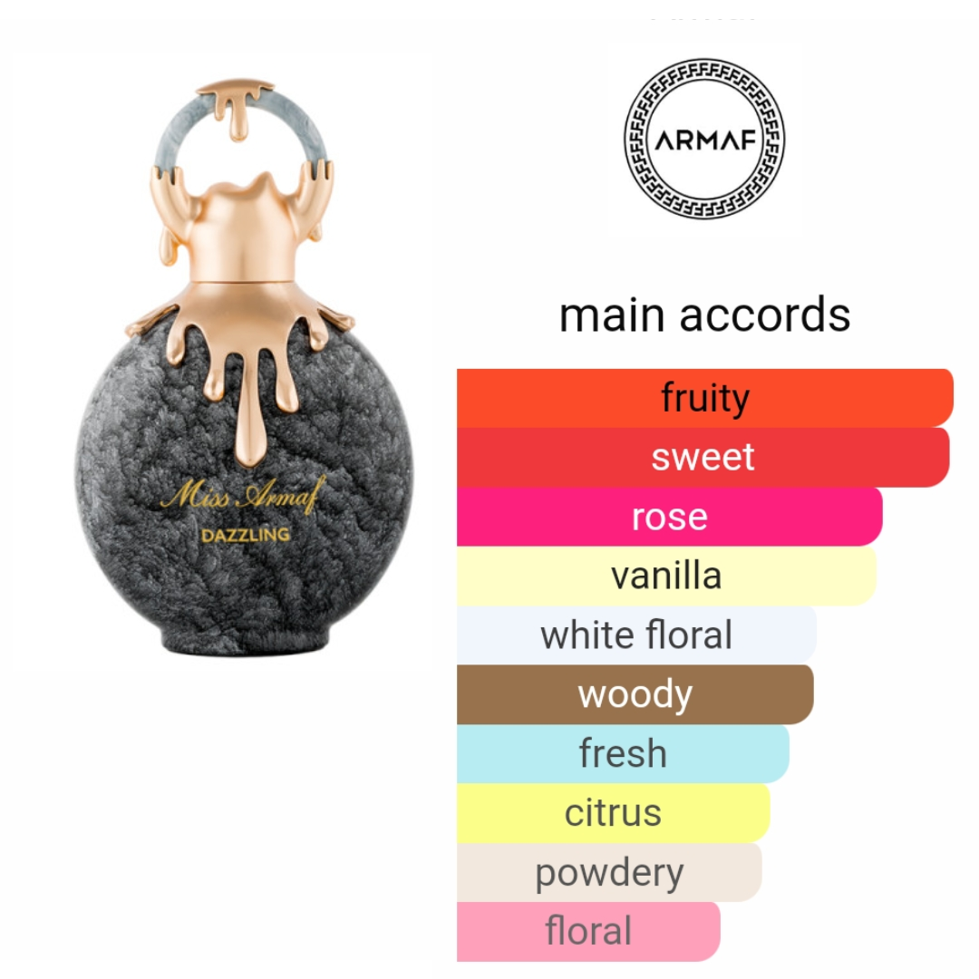 Dazzling by Armaf is a fragrance for women. This is a new fragrance. Dazzling was launched in 2023. Top notes are Rose, Pear, Pineapple, Citruses and Bergamot; middle notes are Jasmine, Gardenia and Pink Pepper; base notes are Vanilla, Sandalwood, Vetiver, Amber and Patchouli.