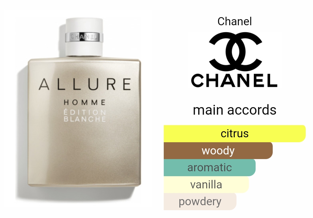 Allure Homme Edition Blanche Eau de Parfum by Chanel is a Oriental Woody fragrance for men. Top notes are Lemon and Bergamot; middle notes are Sandalwood and Woody Notes; base notes are Madagascar Vanilla and Vetiver.